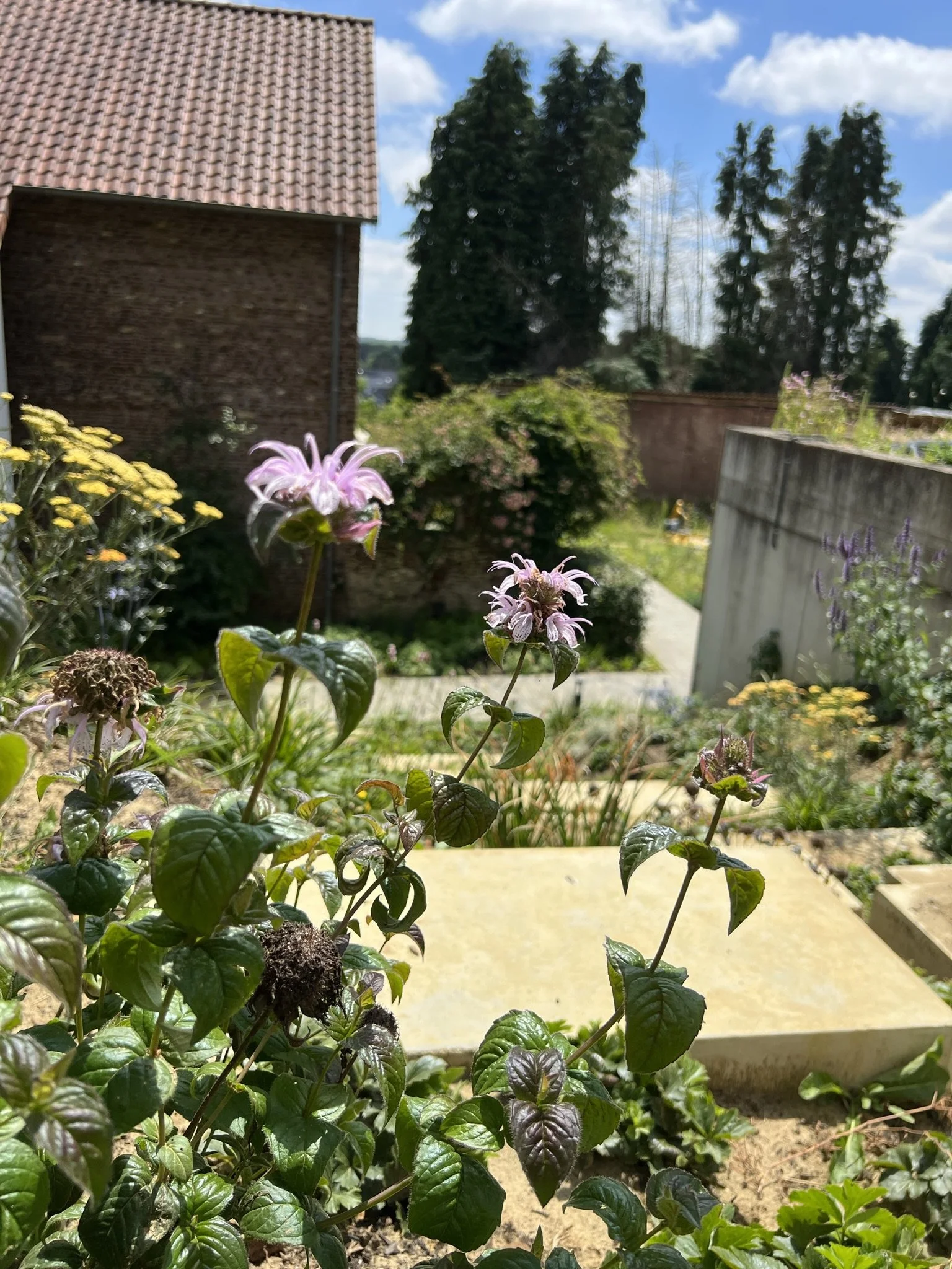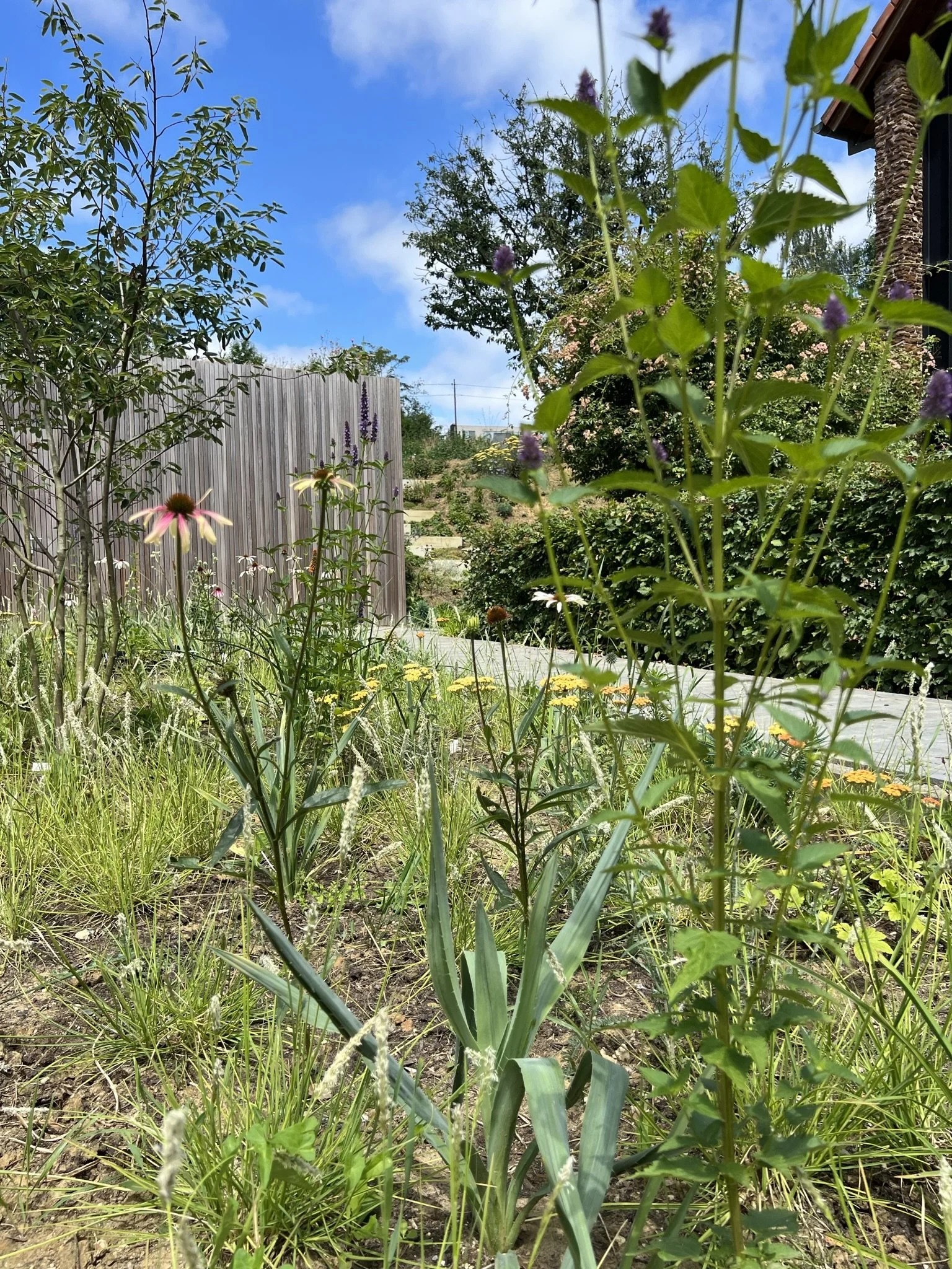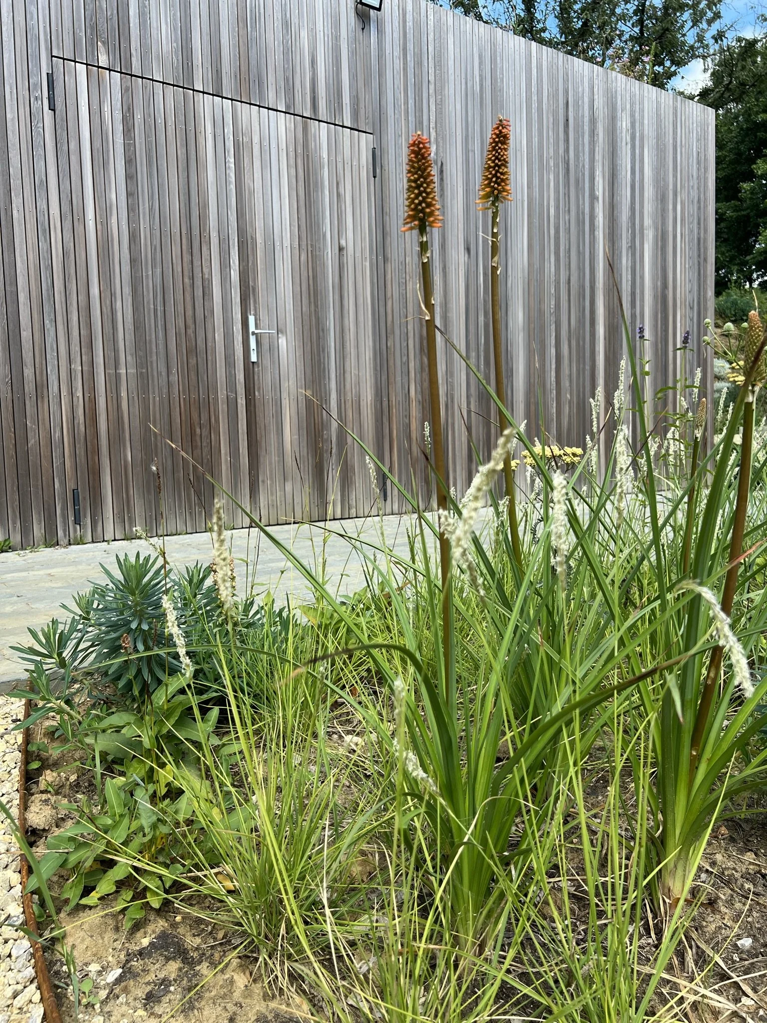 Deze waterrijke voortuin met avontuurlijke trapblokken wekt niet alleen de interesse van kinderen op om op verkenning te gaan, maar is ook een echte eyecatcher die voortdurend in verandering is door de weelderige beplanting. De waterpartij heeft naast zijn esthetische functie ook een functie als waterbufferingszone tijdens hevige regenbuien. De beplantingsvakken in de voortuin zijn de functioneel-ruimtelijke gids richting de voordeur van de woning. De beplante helling met avontuurlijke trapblokken leiden niet alleen naar een verhoogde zone vanwaar je een prachtig zicht hebt over het landschap, ze verbinden ook de hoger gelegen boomgaard met de rest van de tuin.